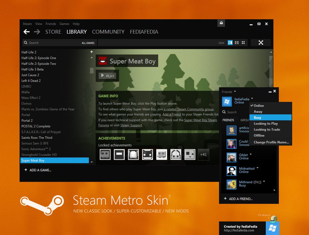Вы можете скачать Steam Metro skin BETA 7 by fediaFedia совершенно бесплатно, без СМС, без ожидания и без рекламы*. Размер Steam Metro skin BETA 7 by fediaFedia составляет 7.42 Mb . Напомним, что мы распространяем Steam Metro skin BETA 7 by fediaFedia совершенно бесплатно и исключительно в ознакомительных целях. Если у Вас возникли претензии по поводу файла, то Вы можете обратится к администрации через обратную связь или оставить сообщение в комментарии. * реклама не появляется при скачивании